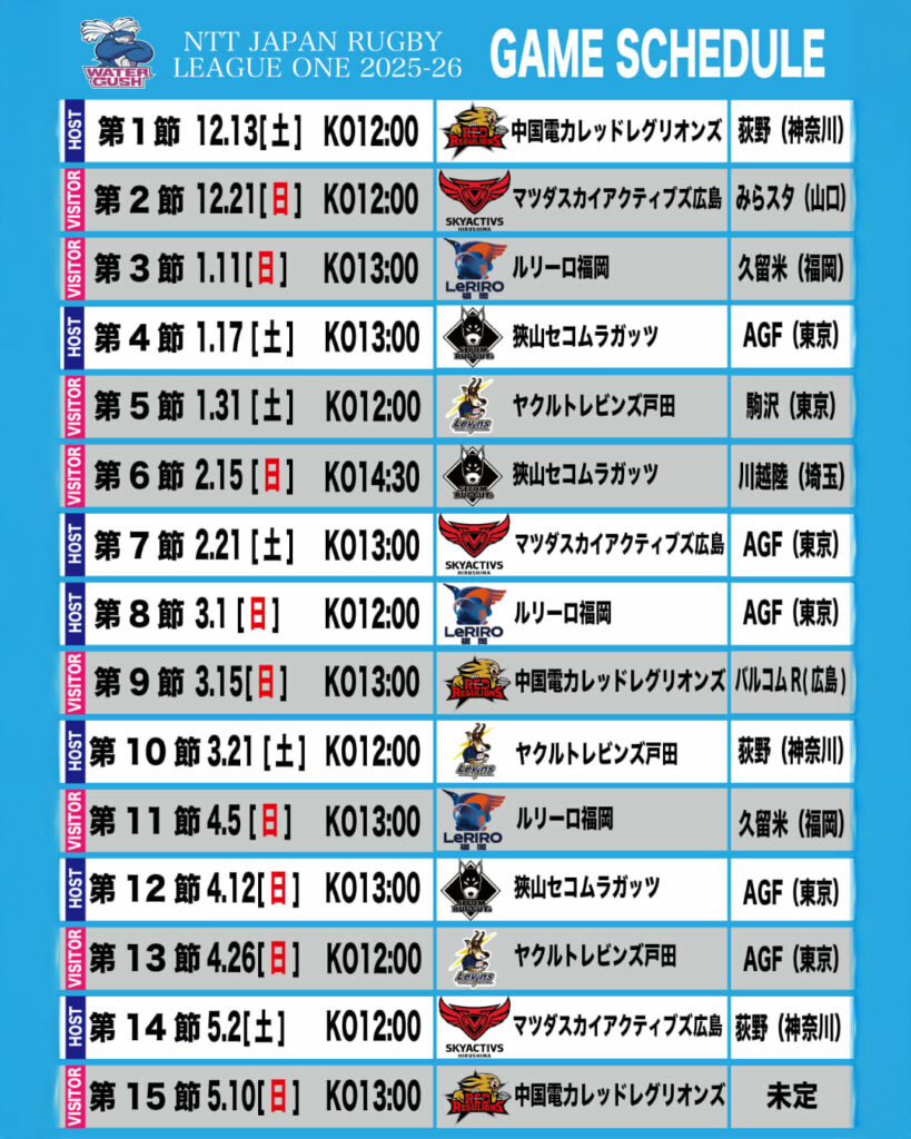 NTT ジャパンラグビー リーグワン 2025-26は、各ディビジョンともに12月13日(土)に開幕します。 クリタウォーターガッシュ昭島は中国電力レッドレグリオンズと厚木市荻野運動公園競技場(神奈川)での開幕戦(ホストゲーム)となります。日程や会場は決まり次第こちらのページで更新いたします。