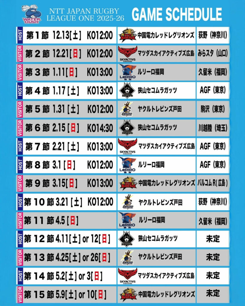 NTT ジャパンラグビー リーグワン 2025-26は、各ディビジョンともに12月13日(土)に開幕します。 クリタウォーターガッシュ昭島は中国電力レッドレグリオンズと厚木市荻野運動公園競技場(神奈川)での開幕戦(ホストゲーム)となります。日程や会場は決まり次第こちらのページで更新いたします。