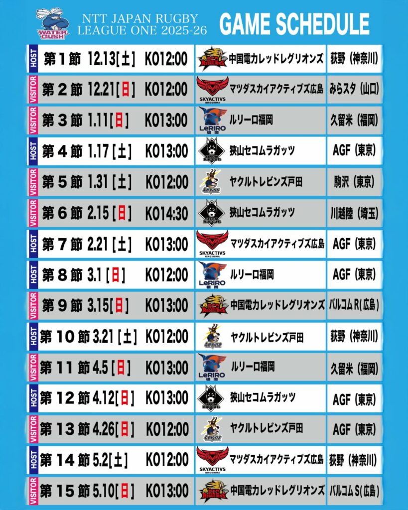 NTT ジャパンラグビー リーグワン 2025-26は、各ディビジョンともに12月13日(土)に開幕します。  クリタウォーターガッシュ昭島は中国電力レッドレグリオンズと厚木市荻野運動公園競技場(神奈川)での開幕戦(ホストゲーム)となります。日程や会場は決まり次第こちらのページで更新いたします。