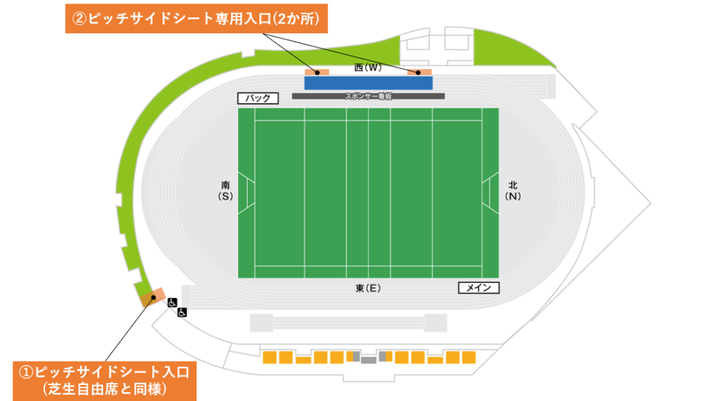 入場方法:上記画像➀を通り②のピッチサイドシート専用入口より入場